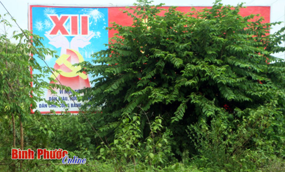 BP - Trên QL13, đoạn giáp ranh giữa huyện Hớn Quản và thị xã Bình Long có tấm pa-nô “núp” trong lùm cây nên người đi đường không hiểu đang tuyên truyền nội dung gì.