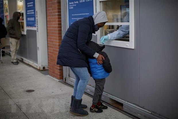 Nhân viên y tế lấy mẫu xét nghiệm COVID-19 cho trẻ em ở Brooklyn, New York (Mỹ). (Ảnh: The New York Times/TTXVN)