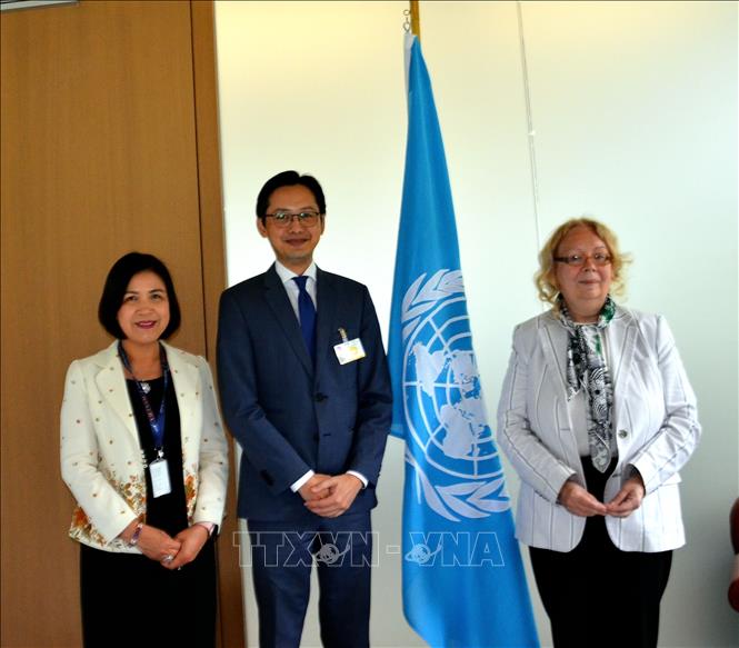 Trợ lý Bộ trưởng Bộ Ngoại giao Đỗ Hùng Việt (đứng giữa) trong cuộc gặp Tổng Giám đốc Văn phòng LHQ tại Geneva Tatiana Valovaya ngày 27-6. Ảnh: Tố Uyên - P/v TTXVN tại Geneva