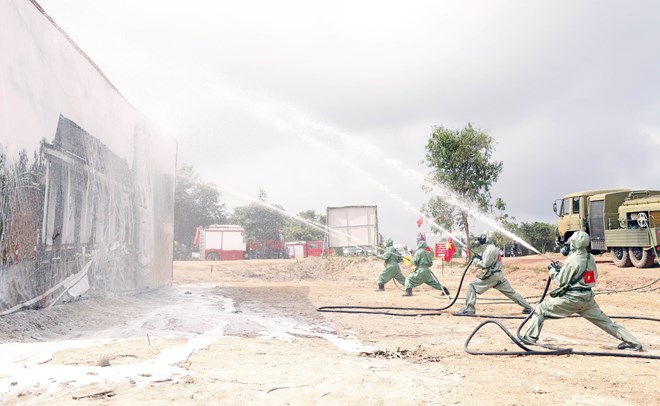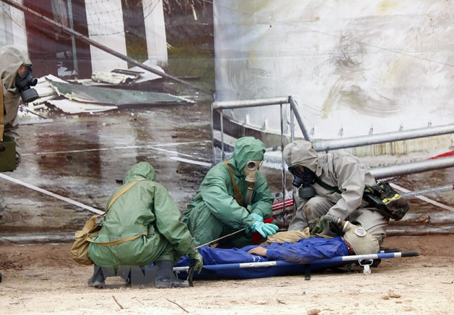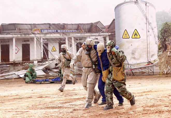 Lực lượng phòng hóa của Việt Nam phun thuốc khử độc tại một vụ rò rỉ khí độc trong một tình huống giả định tại buổi diễn tập. (Ảnh: Phạm Kiên/TTXVN)
