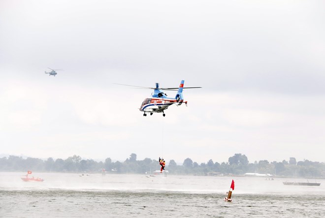 Trực thăng của Việt Nam tham gia cứu hộ trong một tình huống giả định tại buổi diễn tập. (Ảnh: Phạm Kiên/TTXVN)