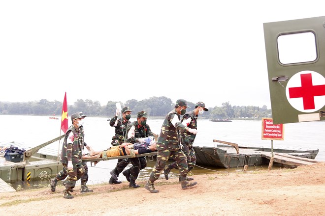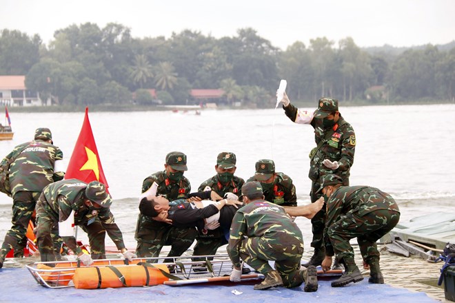 Lực lượng quân y Việt Nam đưa người dân đi cấp cứu trong một tình huống giả định tại buổi diễn tập. (Ảnh: Bá Thành/TTXVN)