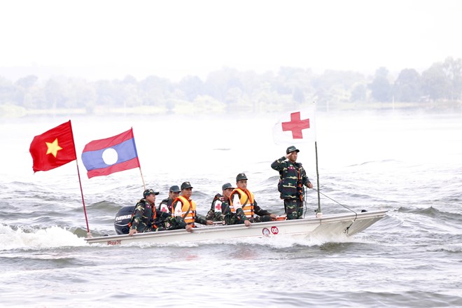 Một canô của quân y Việt Nam và Lào tại buổi diễn tập. (Ảnh: Phạm Kiên/TTXVN)
