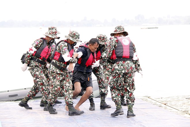 Lực lượng quân y Campchia đưa một người dân đi cấp cứu trong một tình huống giả định tại buổi diễn tập. (Ảnh: Bá Thành/TTXVN)