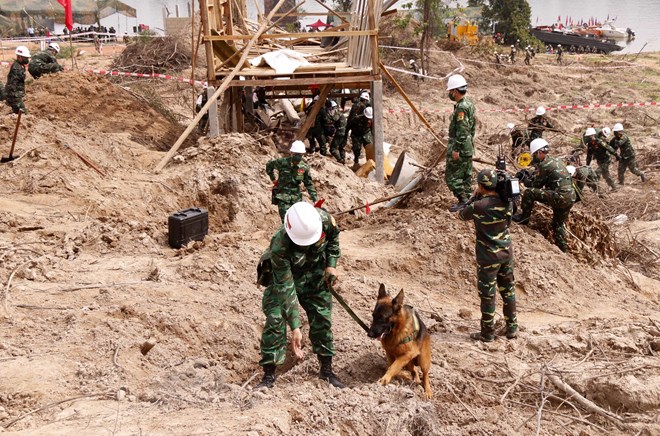 Lực lượng cứu hộ của Việt Nam sử dụng chó nghiệp vụ tìm kiếm người bị vùi lấp trong một tình huống giả định tại buổi diễn tập. (Ảnh: Phạm Kiên/TTXVN)