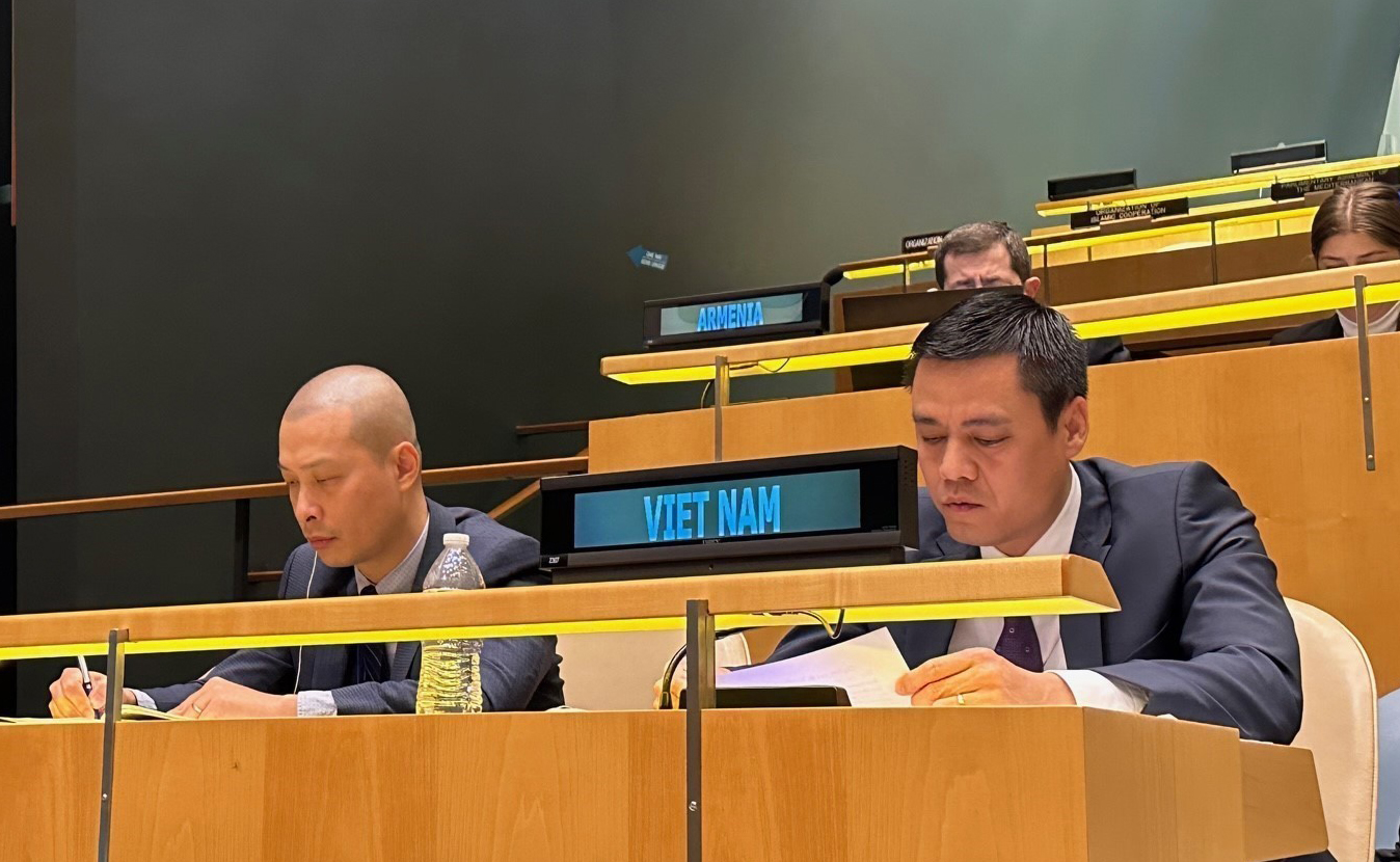 Đại sứ Đặng Hoàng Giang, Trưởng Phái đoàn Đại diện Việt Nam tại Liên hợp quốc (LHQ), phát biểu tại phiên họp của ĐHĐ LHQ ngày 6-2-2023