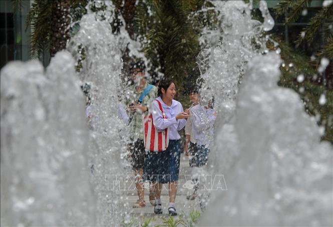 Người dân làm mát tại đài phun nước trong ngày nắng nóng ở Băng Cốc, Thái Lan. Ảnh minh họa: AFP/TTXVN