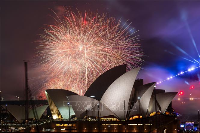 Màn trình diễn pháo hoa lúc 9 giờ tối (giờ địa phương) dành cho gia đình ở Cầu cảng Sydney, Australia, trong đêm Giao thừa 31-12-2023. Ảnh: AFP/TTXVN