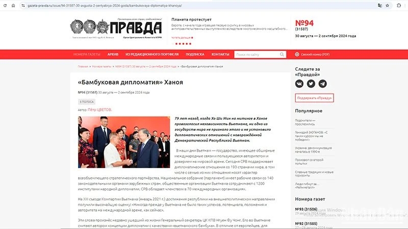 Bài viết của tác giả Peter Tsvetov trên Báo "Sự thật" của Đảng Cộng sản Liên bang Nga. (Ảnh chụp màn hình)