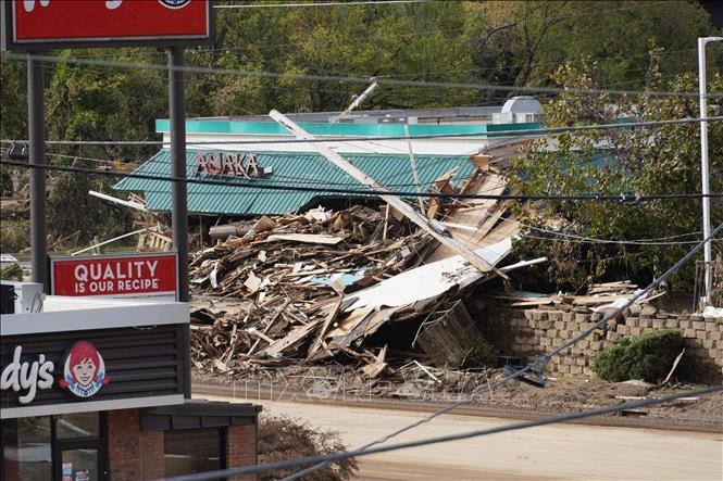 Một nhà hàng bị phá hủy sau khi bão Helene quét qua Asheville, bang North Carolina, Mỹ ngày 1-10-2024. Ảnh: Kyodo/TTXVNBắc Carolina và Georgia đều là hai tiểu bang bầu cử quan trọng nằm trong khu vực thảm họa do bão Helene gây ra.