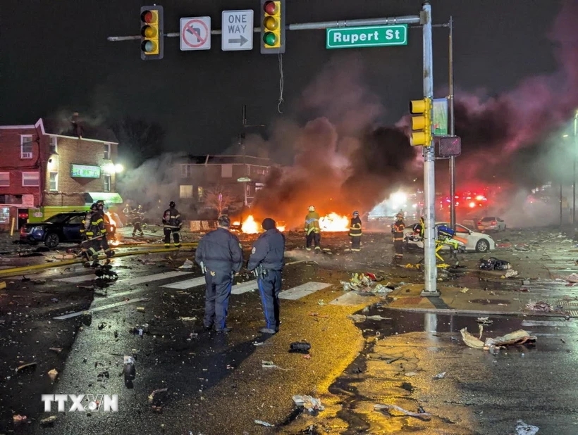 Lực lượng khẩn cấp được triển khai tại hiện trường máy bay cứu thương rơi ở Đông Bắc Philadelphia, Mỹ ngày 31-1-2025. (Ảnh: CBS News/TTXVN)