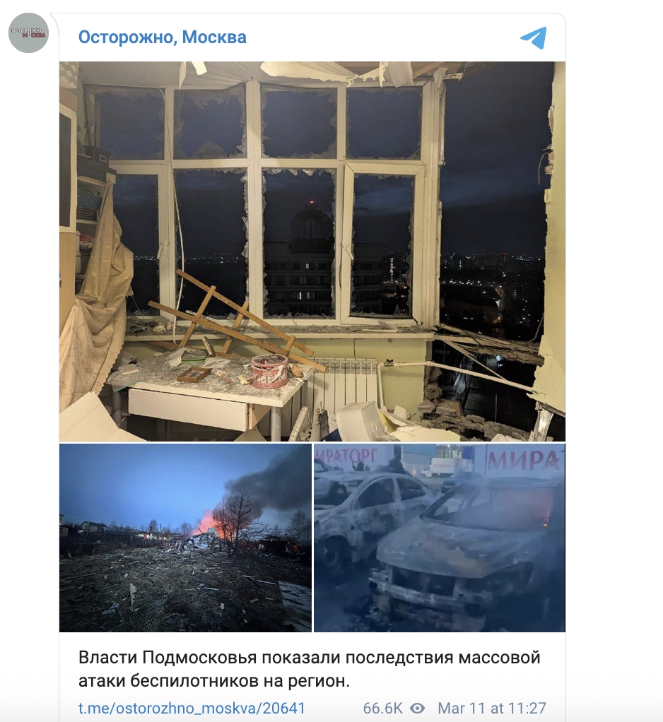 Kênh Telegram Ostorozhno Moskva đăng tải hình ảnh về hậu quả cuộc tấn công bằng UAV của Ukraine ngày 11-3-2025. Ảnh chụp màn hình