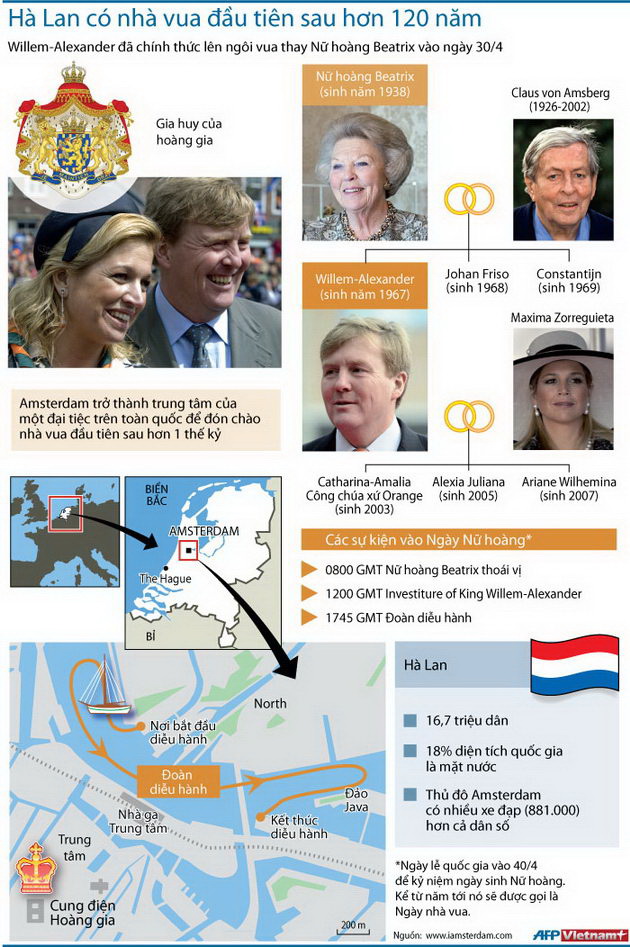 Quốc vương Willem-Alexander 46 tuổi, là vị Vua đầu tiên của Hà Lan kể từ năm 1890 và cũng là người đầu tiên giữ ngôi vị này trong làn sóng mới gồm các vị vua tương đối trẻ ở châu Âu. Theo kế hoạch, ông sẽ tuyên thệ nhậm chức tại nhà thờ Nieuwe Kerk vào tối nay theo giờ Việt Nam trước khi diễn ra phiên họp chung của 2 viện Quốc hội.