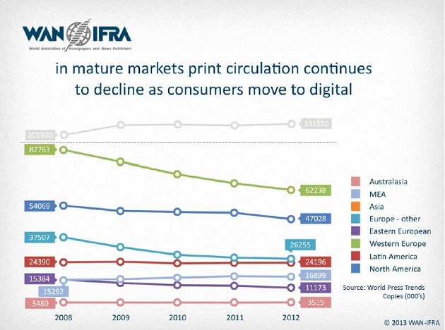 Ngoại trừ một số nước châu Á và các quốc gia thuộc nhóm BRICS, nơi nhìn chung số lượng phát hành báo in vẫn đang giữ được mức tăng trưởng, các thị trường truyền thống như châu Âu và Mỹ đều đang phải đối mặt với cuộc suy thoái nghiêm trọng. Ông Peyregne dẫn ra thông số cho biết, từ năm 2008 đến năm 2012, số lượng phát hành nói chung của báo in đã sụt giảm tới 26% (*).