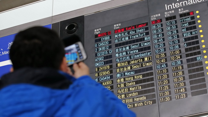Một người đứng nhìn bảng hiệu giờ hạ cánh các chuyến bay ở sân bay Bắc Kinh (Trung Quốc), trong đó có chuyến may MH370 của Malaysia Airlines