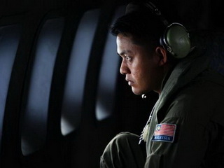 Một lính không quân Malaysia quan sát xuống biển để tìm chiếc máy bay mất tích