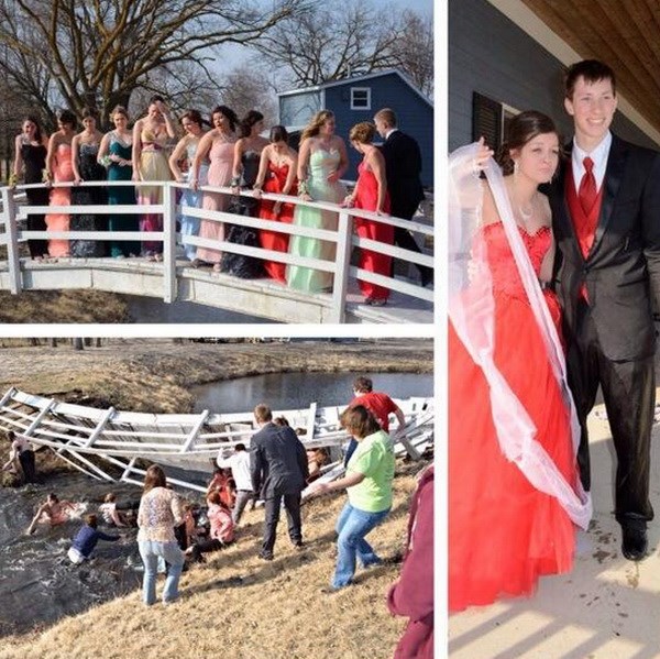 Nhóm học sinh trên đã quyết định ghi lại những khoảnh khắc đẹp trên một chiếc cầu nhỏ. Tuy nhiên, do không để ý tới tải trọng của cây cầu, nhóm học sinh trên đã ngã xuống sông khi cây cầu đổ sập.