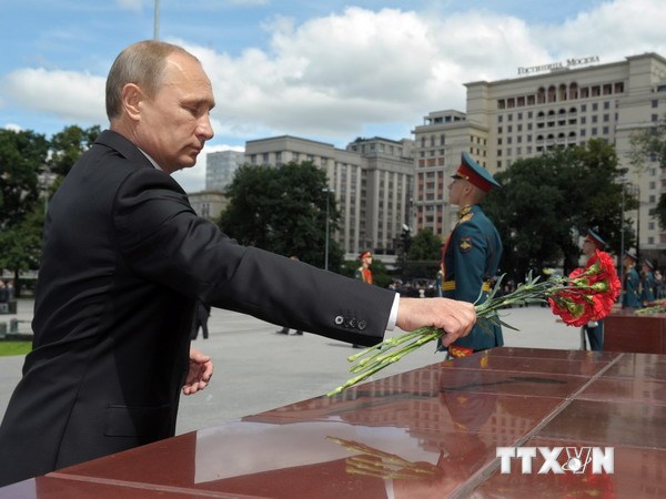 Tổng thống Nga Vladimir Putin đặt hoa tưởng niệm tại mộ các chiến sỹ vô danh ở thủ đô Moskva. (Nguồn: AFP/TTXVN)Tham dự lễ đặt vòng hoa cùng Tổng thống Putin để tưởng nhớ những người đã ngã xuống trong cuộc Chiến tranh vệ quốc vĩ đại còn có Thủ tướng Dmitry Medvedev, Chánh văn phòng tổng thống, chủ tịch hai viện quốc hội Nga và các cựu chiến binh.