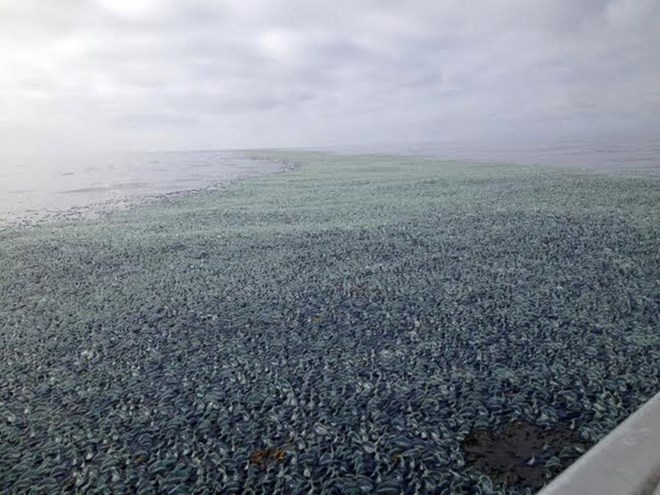 Những con Velella Velella có vẻ ngoài khá kỳ lạNhững sinh vật này đã theo gió và dòng chảy tới bờ biển La Push, tạo nên một tấm thảm sinh vật khổng lồ. Chúng đặc biệt xuất hiện nhiều ở bờ biển phía Tây của Canada đến Nam California.