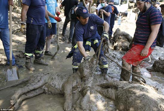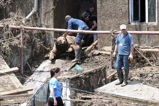 ![]() Nhân viên dọn dẹp lôi xác một chú gấu bị bắn chết ra khỏi một tòa nhà đổ nát sau cơn lũ. |