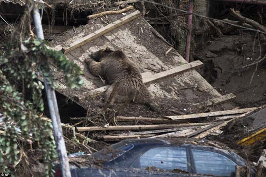 ![]() Xác gấu nằm cạnh một chiếc xe bị phá hủy do trận lũ vừa qua. |