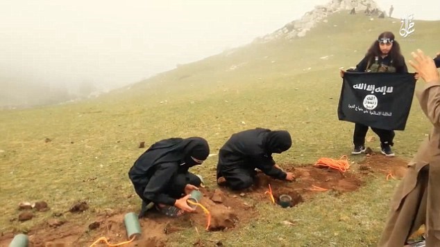 IS chôn bom xuống đất. (Nguồn: Daily Mail)Đoạn băng này dường như đã được dàn dựng rất kỹ lưỡng, với cảnh mở đầu quay hai chiến binh IS cưỡi ngựa qua những ngọn đồi.