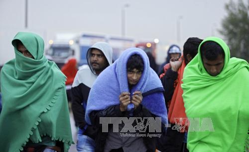 .jpg) Người di cư vượt qua biên giới sang Áo sau khi được chở bằng xe buýt từ Hungary tới khu vực cửa khẩu giữa Hegyeshalom (Hungary) và Nickeldorf (Áo) ngày 4-9