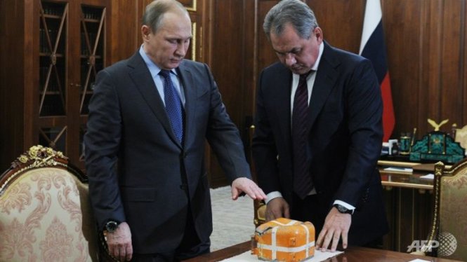 Tổng thống Nga Putin và Bộ trưởng Quốc phòng nước này Sergei Shoigu đang xem xét hộp đen chiếc máy bay Su-24 bị Thổ Nhĩ Kỳ bắn rơi hôm 24-11