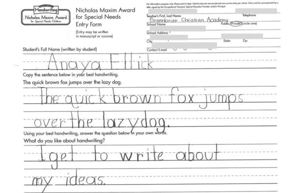 Nét chữ của cô bé không khác người bình thường. (Nguồn: Greenbrier Christian Academy)Bà Kathleen Wright, chủ tịch cuộc thi chia sẻ với ABC News, bài thi viết của cô bé khiến ban giám khảo “ngỡ ngàng.”