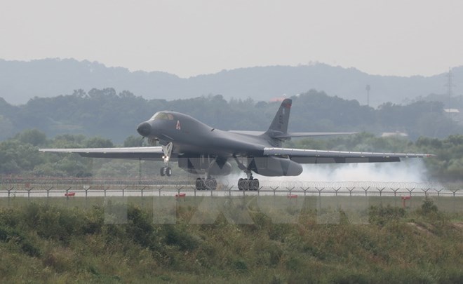 Máy bay ném bom chiến lược siêu thanh B-1B Lancer hạ cánh tại Căn cứ không quân Osan ở Pyeongtaek, phía nam Seoul ngày 21/9. (Nguồn: Yonhap/TTXVN)Trước đó một ngày, trong một động thái nhằm phô trương sức mạnh chống Bình Nhưỡng, 2 máy bay B-1B của Mỹ đã bay trên căn cứ không quân Osan ở Pyeongtaek, cách thủ đô Seoul của Hàn Quốc khoảng 70km.