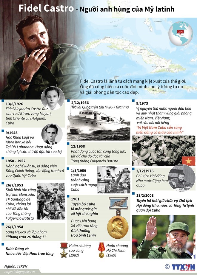 Lãnh tụ Fidel Castro đã ra đi về cõi vĩnh hằng ở tuổi tròn 90 sau chặng đường dài hơn 60 năm đấu tranh đầy hy sinh gian khổ kể từ khi ông lãnh đạo phong trào học sinh, sinh viên Cuba những năm giữa thế kỷ 20, trải qua cuộc khởi nghĩa vũ trang ngày 267-1953 và sau đó là cuộc chiến tranh du kích ở chiến khu Sierra Maestra lật đổ chế độ độc tài Batista, mở ra kỷ nguyên độc lập thực sự cho nhân dân Cuba bắt đầu từ 1-1-1959.