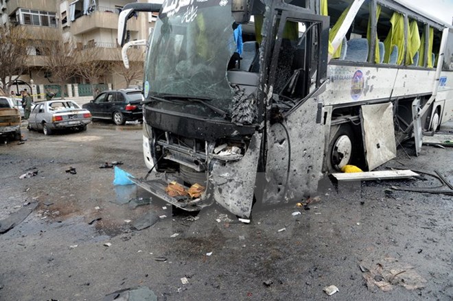 Chiếc xe buýt bị phá hủy tại hiện trường vụ đánh bom ở Damascus ngày 11/3.