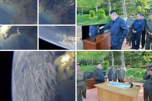 Nhà lãnh đạo Triều Tiên Kim Jong-un (ảnh trên và dưới, bên phải) theo dõi vụ phóng tên lửa Hwasong-12 ở Pukchang, tỉnh Nam Pyongan ngày 21-5