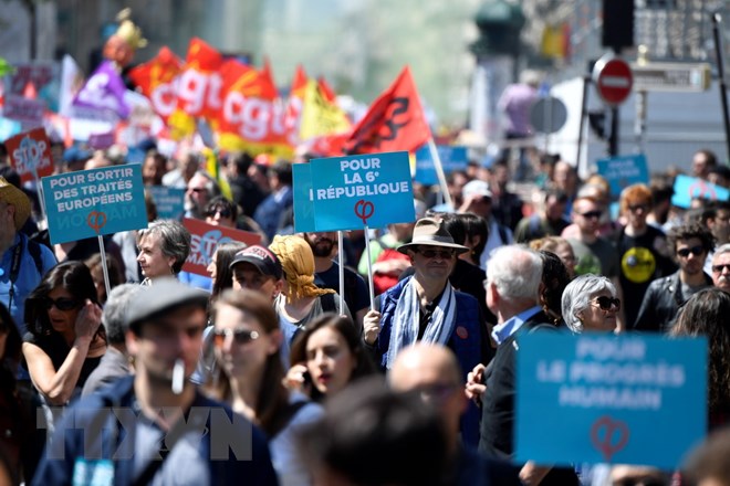 Tuần hành phản đối các kế hoạch cải cách của Tổng thống Pháp Emmanuel Macron tại Paris. (Nguồn: AFP/TTXVN)