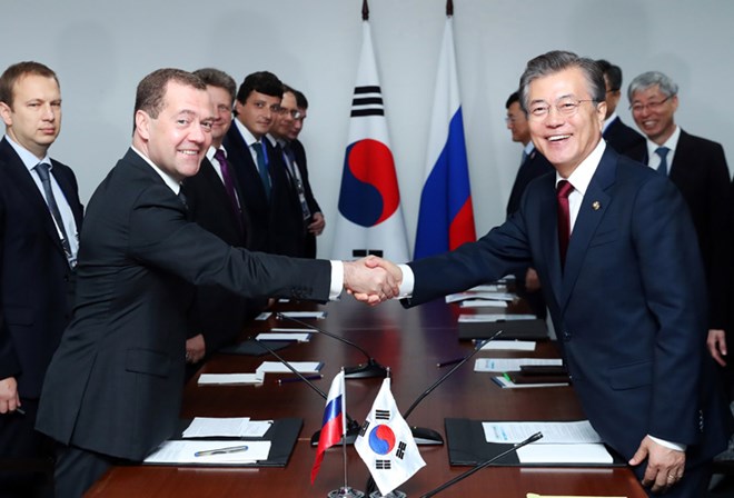 Tổng thống Hàn Quốc Moon Jae-in (phải) và Thủ tướng Nga Dmitry Medvedev. (Nguồn: Yonhap)