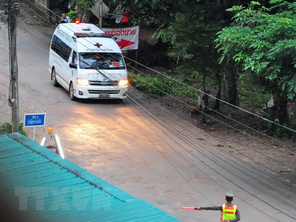 Xe cứu thương chở các thành viên đội bóng sau khi họ được đưa ra khỏi hang. (Ảnh: THX/TTXVN)