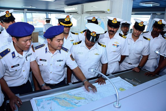 Đoàn sĩ quan trẻ ICG nghe giới thiệu chặng hành trình của tàu CSB 8001 từ Vũng Tàu (Việt Nam) đến cảng Chennai (Ấn Độ) dài gần 2.500 hải lý.
