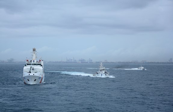 Tàu CSB 8001 (ngoài cùng bên trái) trong đội hình triển khai luyện tập chung với các tàu của ICG về tìm kiếm cứu nạn.