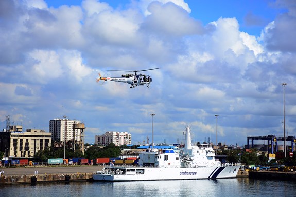 Đội hình tàu và máy bay trực thăng của ICG đón tàu CSB 8001 tại cảng Chennai.