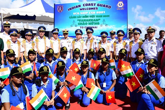Thiếu nhi Ấn Độ vẫy Quốc kỳ Việt Nam và Ấn Độ chào đón tàu CSB 8001 cập cảng Chennai, bang Tamil Nadu, Cộng hòa Ấn Độ.