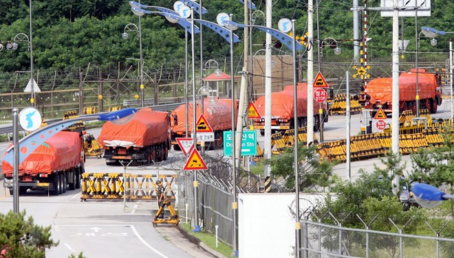 Ảnh tư liệu: Xe chở gạo của Hàn Quốc đi qua trạm kiểm soát ở thành phố biên giới liên Triều Paju để vào Triều Tiên. (Nguồn: AFP/ TTXVN)