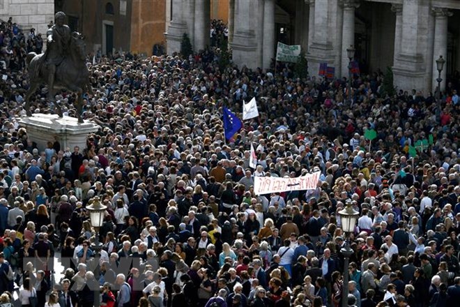 Người dân Italy biểu tình phản đối tình trạng xuống cấp về cơ sở hạ tầng ở thủ đô Rome tháng 10-2018