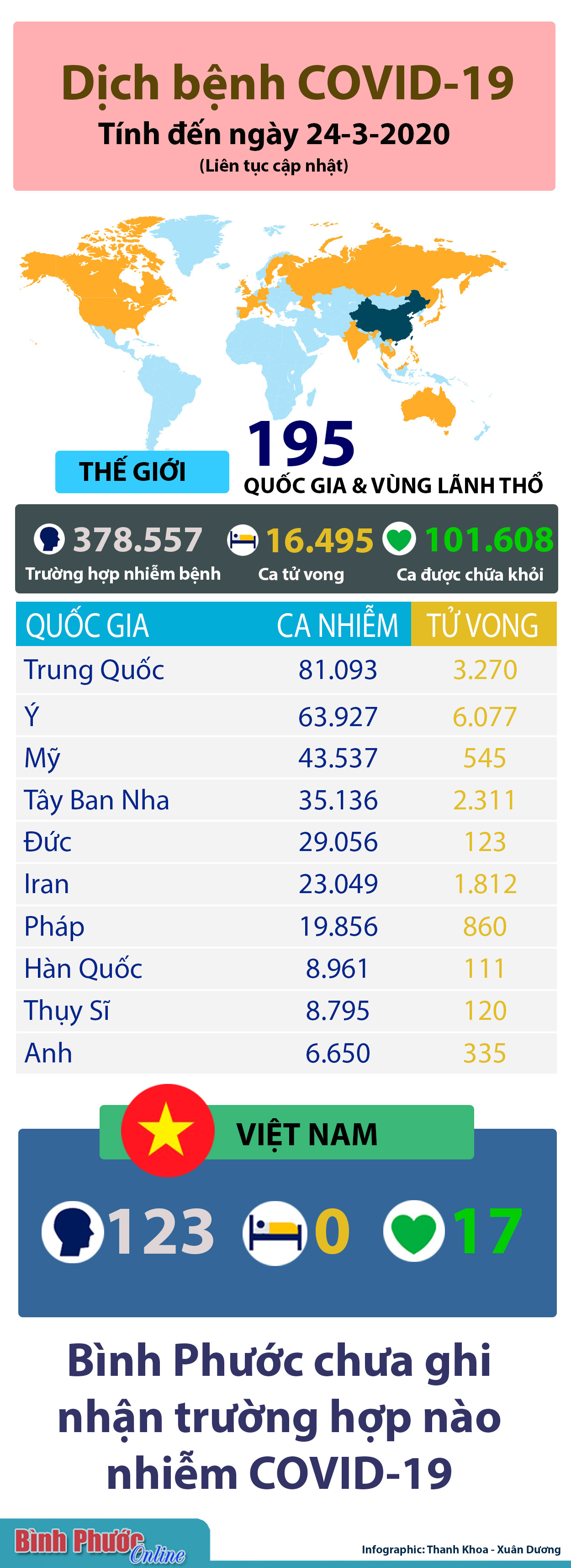 Thế giới có 195 quốc gia và vùng lãnh thổ có ca nhiễm Covid-19, với 378.557 người nhiễm bệnh, 16.495 người tử vong. Mỹ thêm gần 10.000 người nhiễm. Số người chết ở Italy vượt 6.000. Chính phủ Anh cấm người dân ra đường trừ một số trường hợp nhất định. Việt Nam có 123 ca nhiễm, trong đó có 1 ca từ Malaysia trở về, khiến gần 1.600 người phải cách ly.