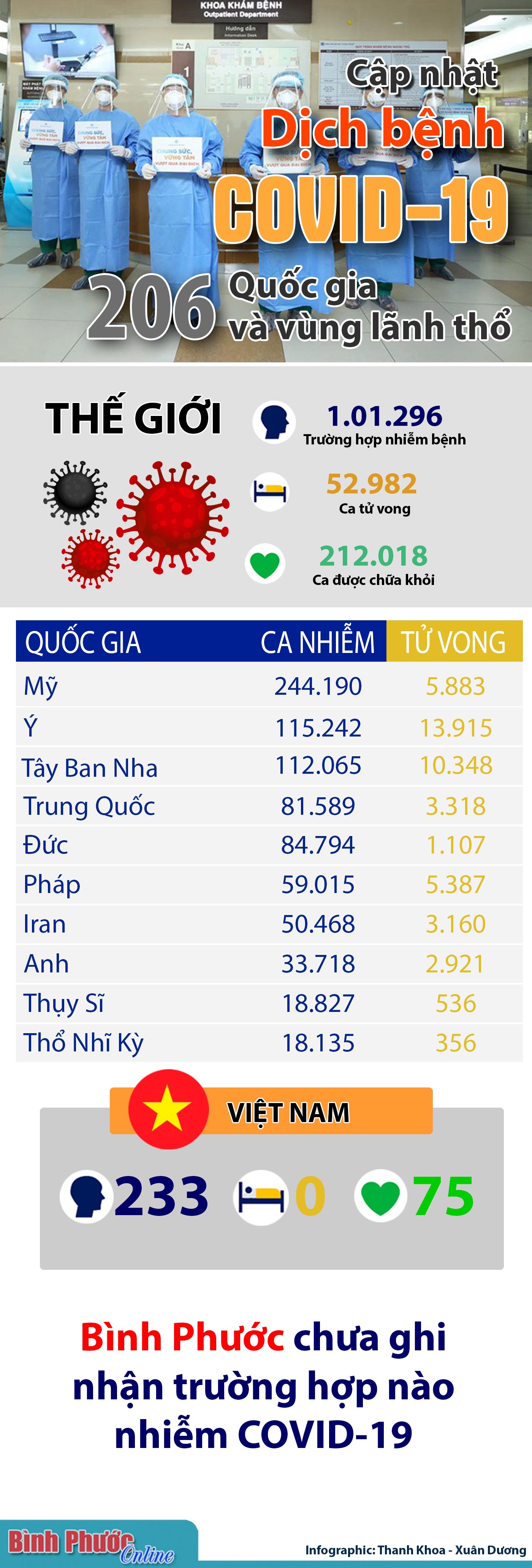 Thế giới có 1.014.296 ca nhiễm Covid-19, gần 53.000 ca tử vong. Số ca nhiễm và tử vong ở Châu Âu, Châu Mỹ tiếp tục tăng lên. Các viện dưỡng lão ở Canada, Mỹ đang phải chịu áp lực lớn vì dịch bệnh. Mỹ và các nước phương Tây kêu gọi người dân đeo khẩu trang. Nga kéo dài "ngày không làm việc" tới hết tháng 4 để ngăn chặn sự lây lan của virus.