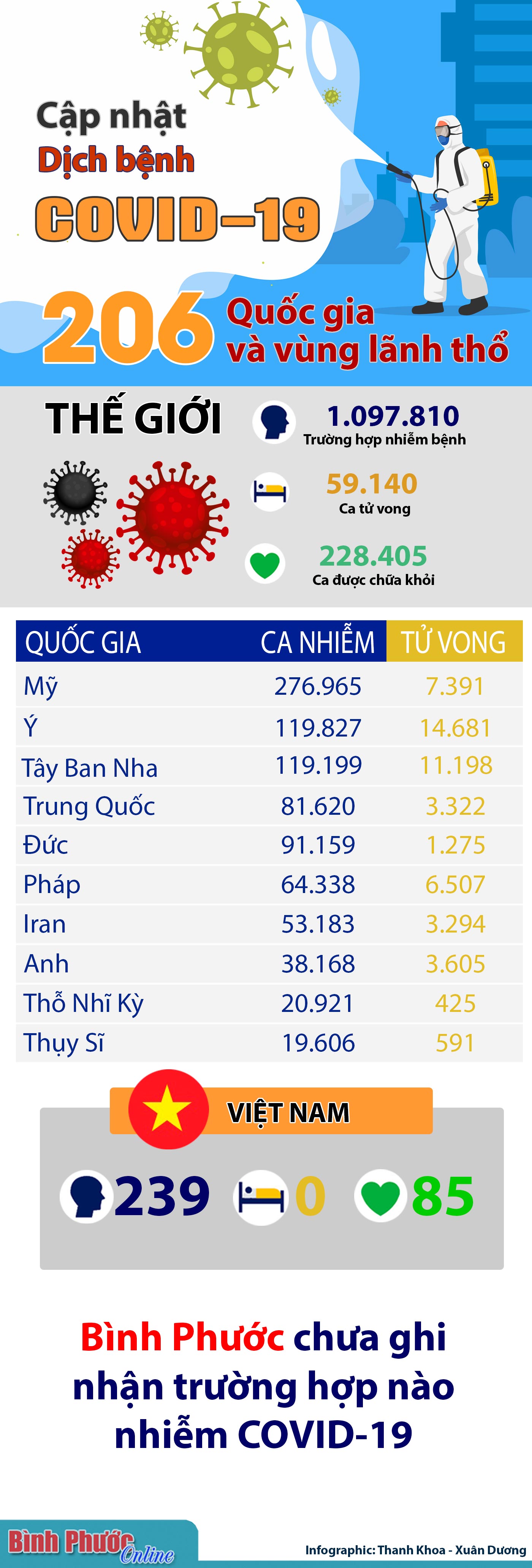 Thế giới có gần 1.100.000 ca nhiễm Covid-19, gần 60.000 ca tử vong. Dịch bệnh bùng phát rất mạnh ở các nước châu Âu. Mỹ vẫn đang là ổ dịch lớn nhất thế giới với 276.965 ca nhiễm, số người chết vì Covid-19 đã bằng số người chết trong vụ 11-9. Bang NewYork đã phải ra lời kêu gọi giúp đỡ khi số người nhiễm bệnh ở bang này đến hơn 100.000. Nga tạm dừng tất cả các chuyến bay, những người muốn bay phải điền vào một văn bản đặc biệt, Chính phủ Nga cũng sẽ chi trả 500 triệu rouble cho những công dân nước này bị kẹt lại ở nước ngoài.