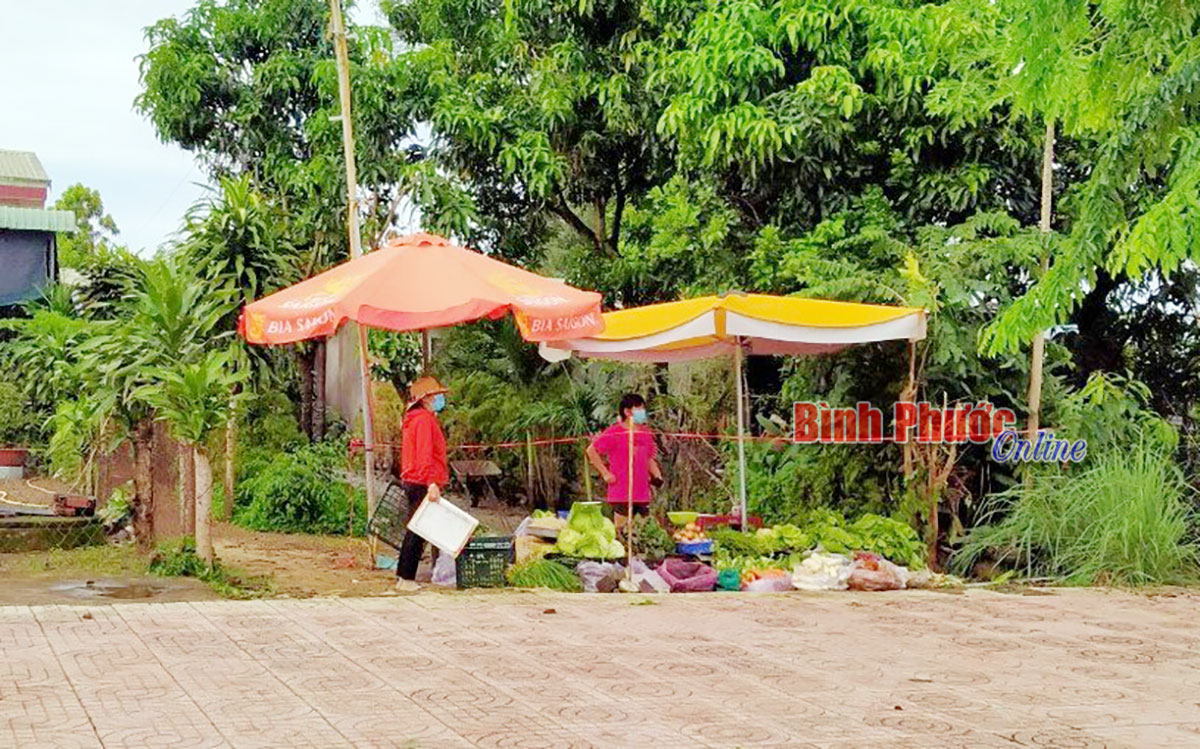 Một số sạp bán rau phục vụ nhu cầu của người dân được bày bán ngay trước nhà, người mua và người bán thực hiện giãn cách theo quy định
