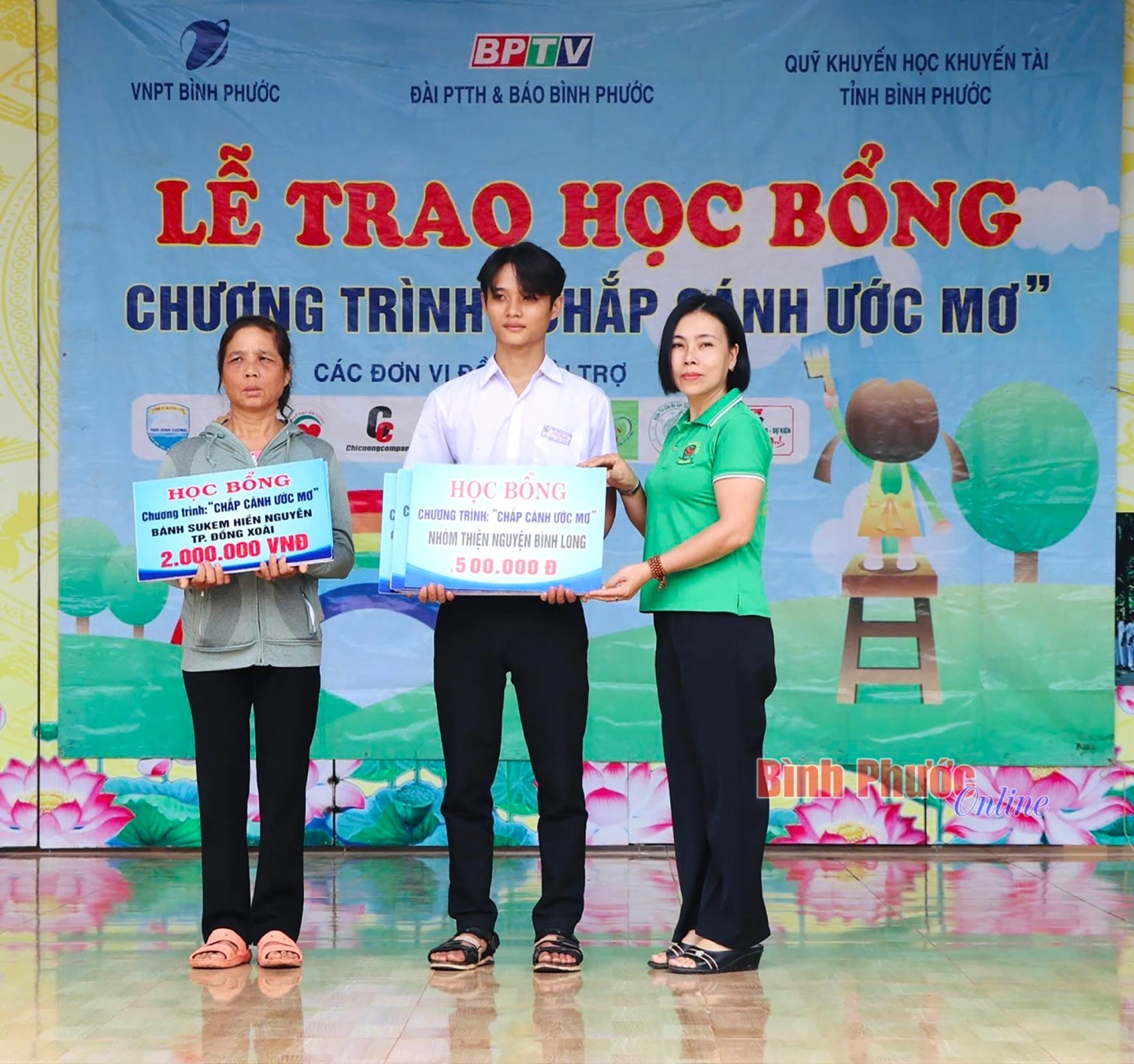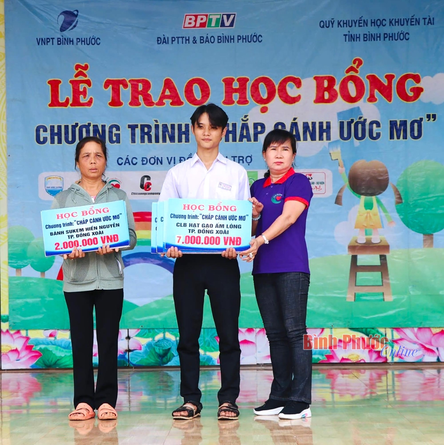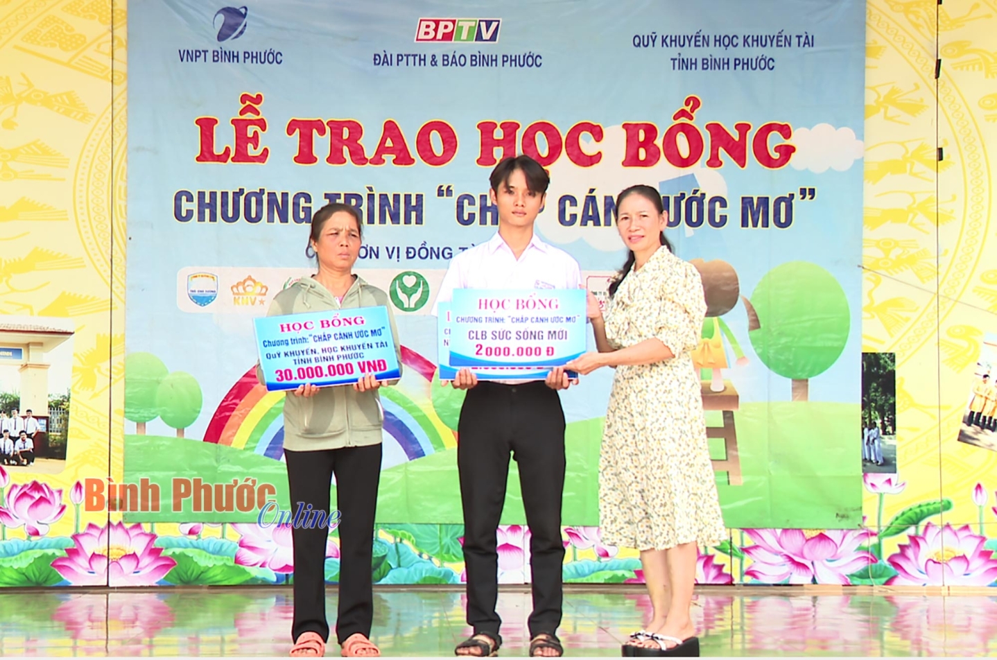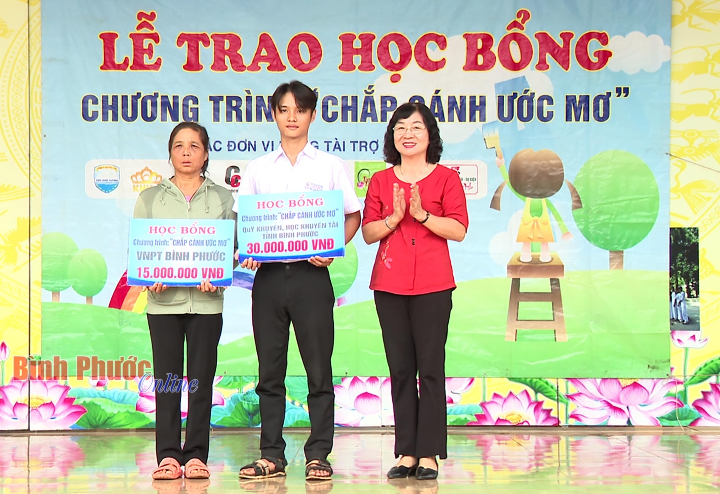 Bà Nguyễn Thị Lan Hương, nguyên Trưởng Ban Tuyên giáo Tỉnh ủy Bình Phước trao bảng tượng trưng 30 triệu đồng của Quỹ khuyến học khuyến tài tỉnh Bình Phước, đồng thời bà cũng trích lương hưu 1 triệu đồng/tháng để đồng hành cùng chương trình
