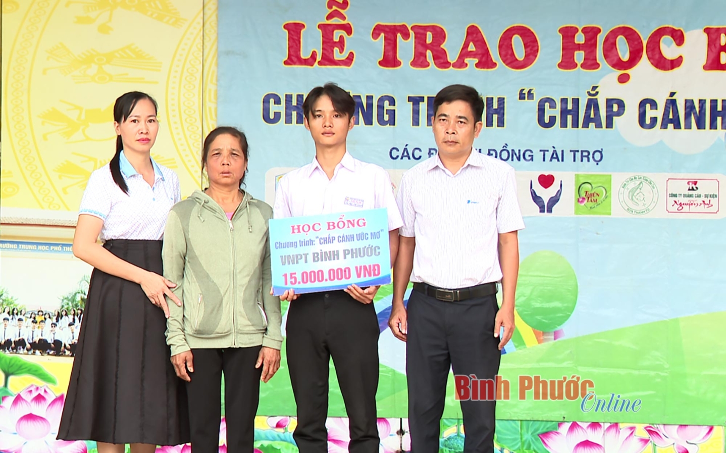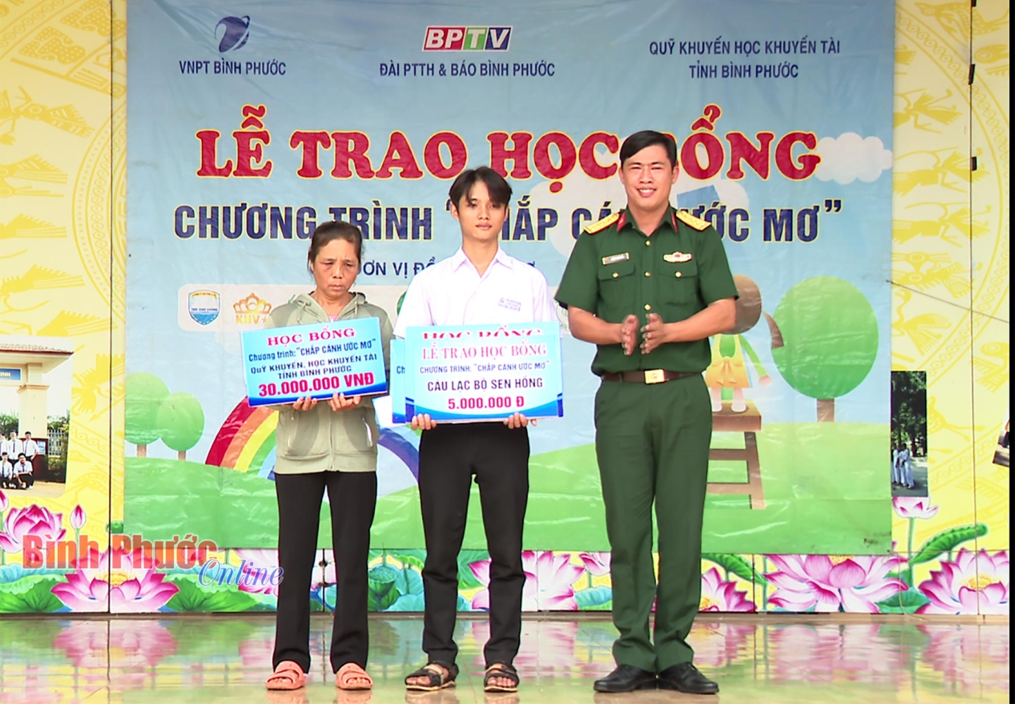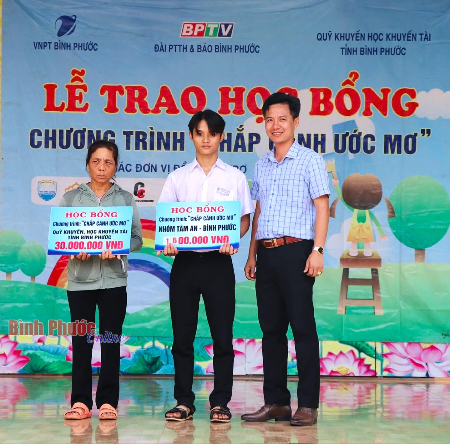 Đại diện nhà tài trợ chính VNPT Bình Phước trao học bổng trị giá 15 triệu đồng “Chắp cánh ước mơ” cho em Hàn Ngọc Hải