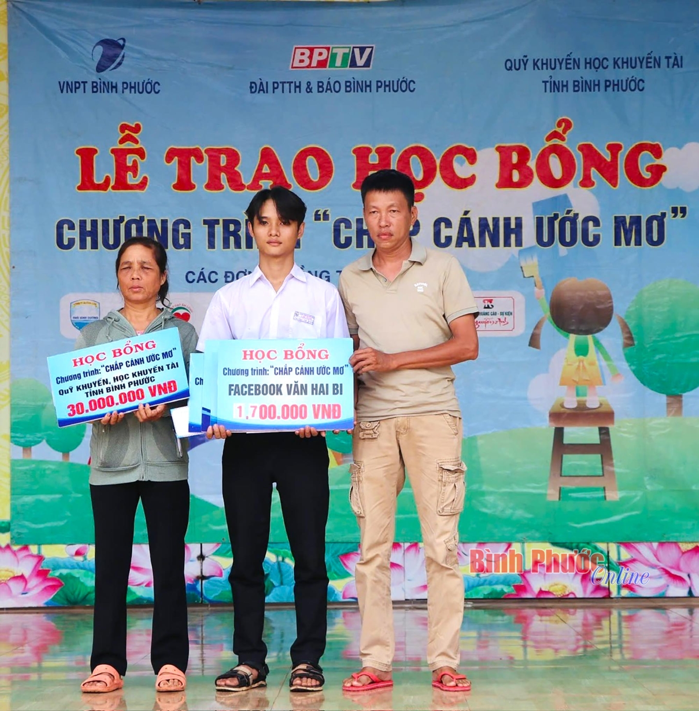 Đại diện lãnh đạo Huyện ủy, HĐND, UBND, UBMTTQVN huyện Lộc Ninh chung tay ủng hộ, trao tặng em Hải bộ máy tính trị giá 30 triệu đồng. Các hội, đoàn thể địa phương cũng tặng thêm nhiều suất học bổng có giá trị