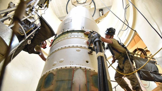 Các phi công Không quân đang làm việc trên một tên lửa đạn đạo gần Căn cứ Không quân Malmstrom ở Montana. Ảnh: Không quân Mỹ